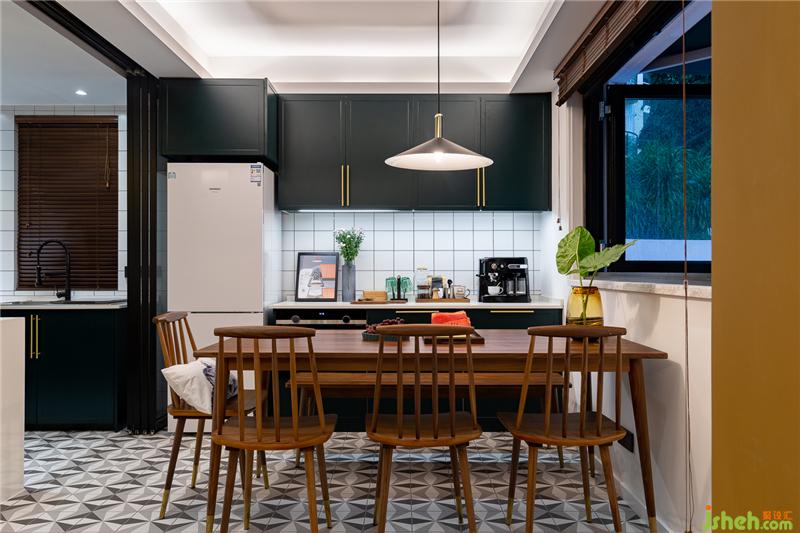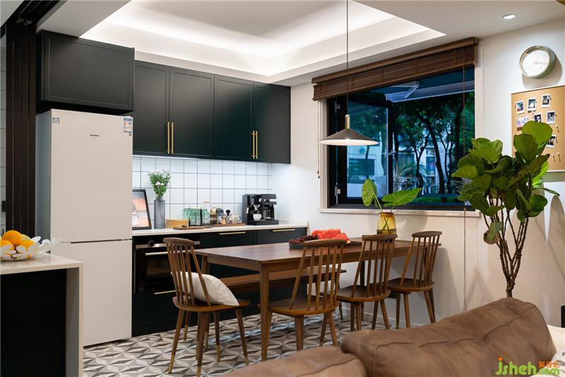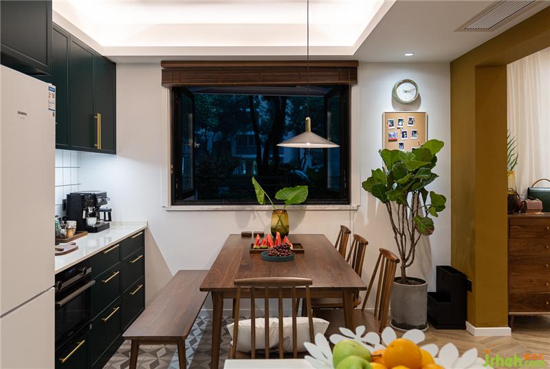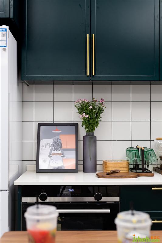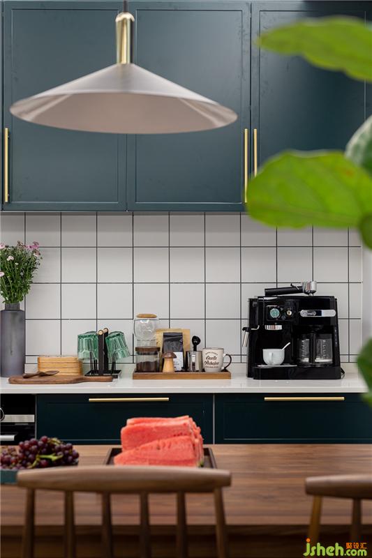 長(zhǎng)凳后方定制了墨綠色壁柜,補(bǔ)充廚房的收納空間,臺(tái)面放置了屋主心心念念的咖啡機(jī)。周末早晨,坐在這里來杯morning coffee,欣賞著窗外的晨光,開啟元?dú)鉂M滿的一天~