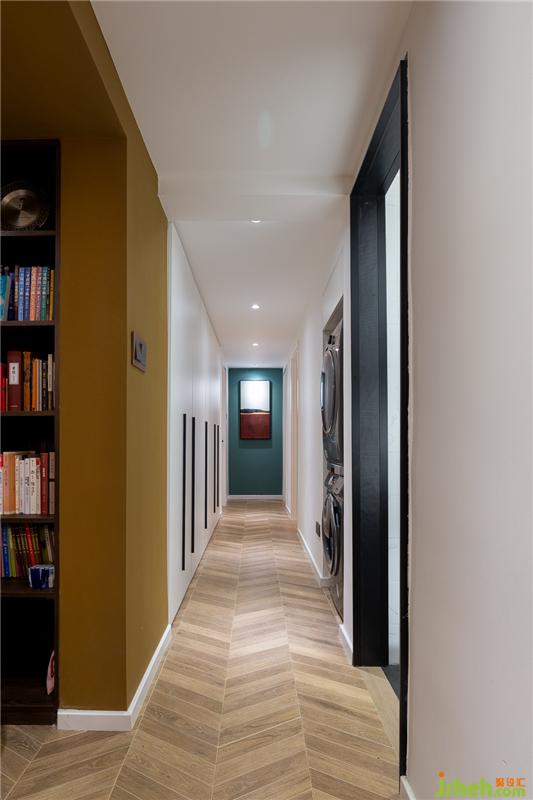 原始的走廊過寬,利用率低,將原入戶門封住后定制了一面儲(chǔ)物柜,收納功能超級(jí)強(qiáng)大。柜體內(nèi)部設(shè)置了活動(dòng)層板,需要的話,原先的入戶門還是可以使用的。