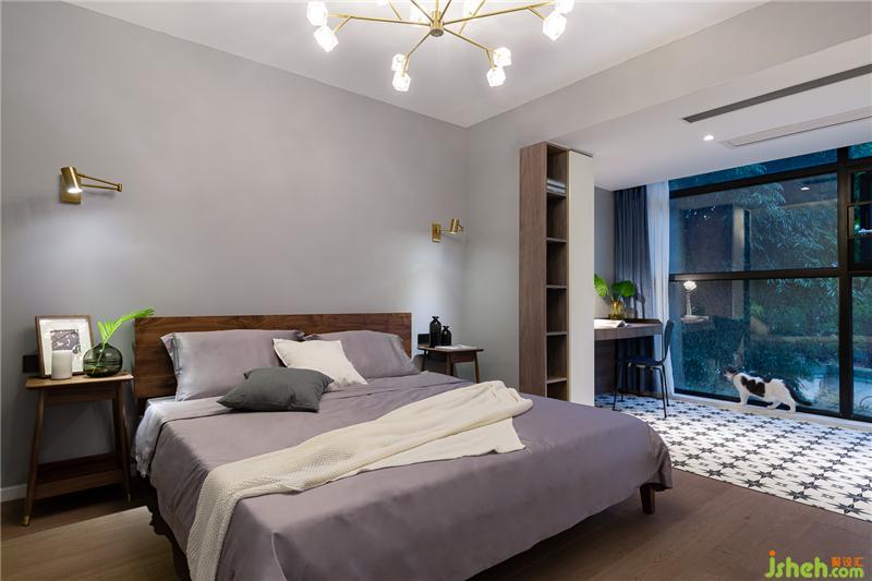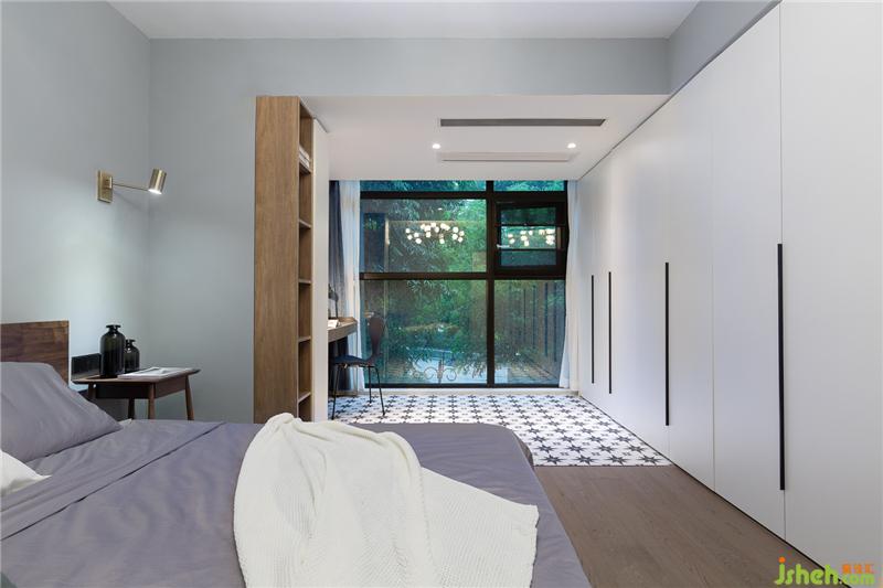 將原有的陽臺納入臥室后,瞬間擴大了臥室的面積,一整面落地窗讓屋內(nèi)通透感十足。不同款式的地板將睡眠區(qū)和休閑區(qū)做了區(qū)分。室內(nèi)設計師