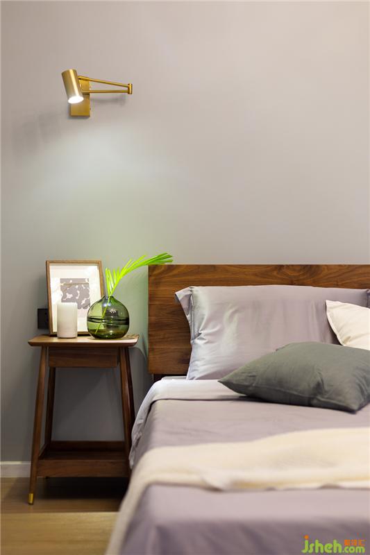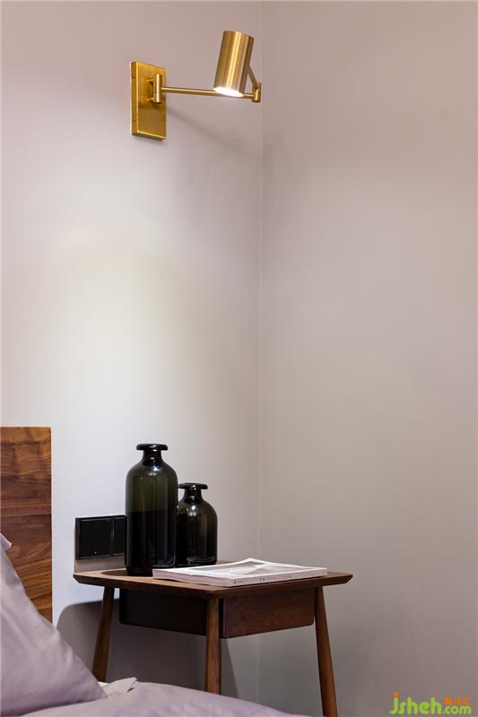 休息的空間無需過多裝飾,兩把木凳充當了床頭柜,小巧簡潔的金色射燈增添精致感。