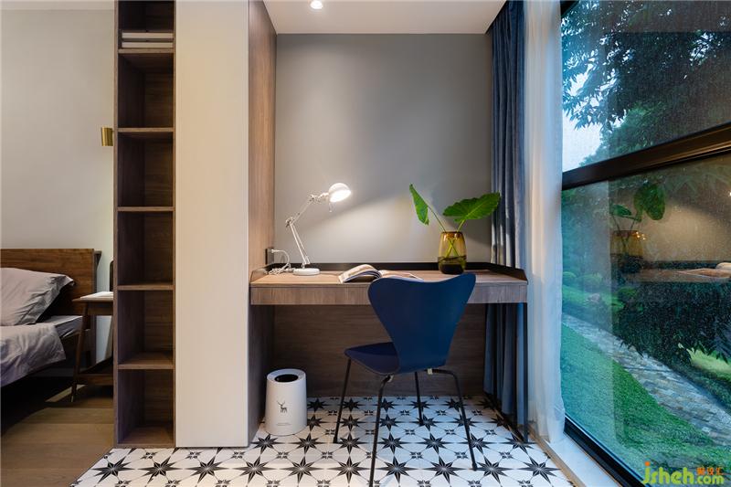 陽臺處有一截承重墻不能拆除,利用其長度,左邊做了開放式書架,右邊做了書桌。臨窗讀書,白紗簾將光線洗得溫柔,窗外綠意蔥蔥,感覺詩意翩翩。
