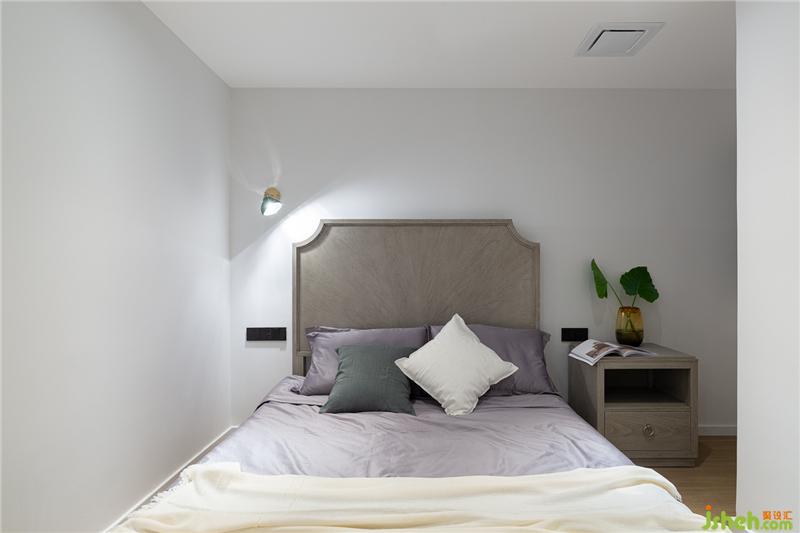 次臥主要用于給長輩居住,設計師將左邊的墻體向兒童房移動,并且利用墻體的咬合,將兒童房和父母房的衣柜都嵌入凹陷處,使之與墻體平行,達到隱形效果。