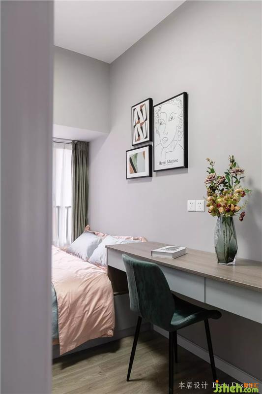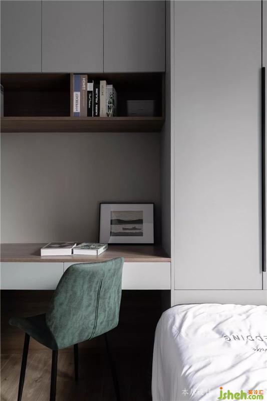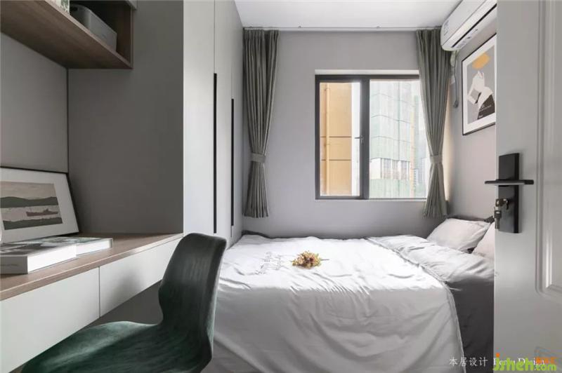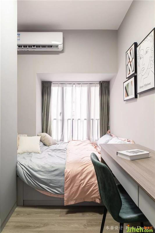這是入戶(hù)后的第一個(gè)房間,衣柜+床一體式,懸空式的書(shū)桌,不占過(guò)多的面積。室內(nèi)設(shè)計(jì)師