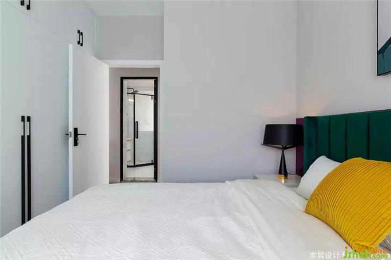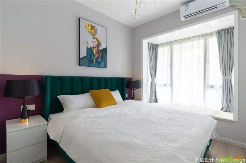 墨綠色的床頭,摩登的插畫,讓臥室的風(fēng)格與客廳截然不同。
