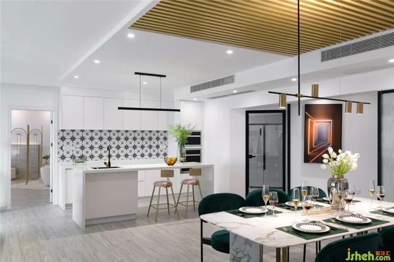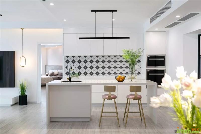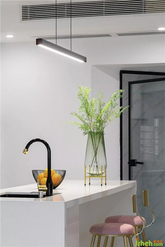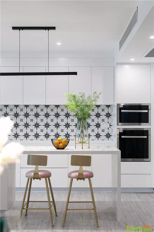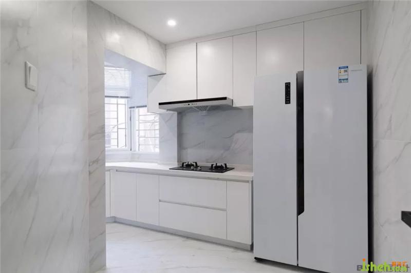 西廚的后方是中式廚房,純白色的壁柜搭配大理石紋的墻磚,整潔簡(jiǎn)約。室內(nèi)設(shè)計(jì)師