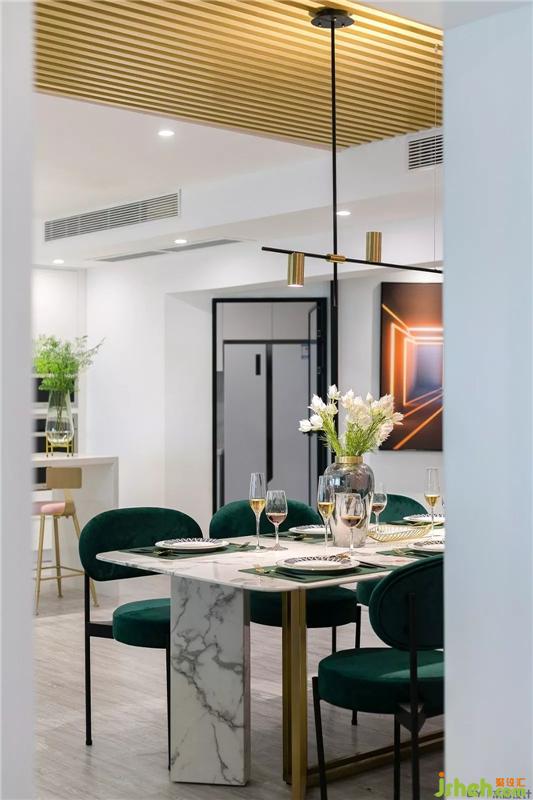 大理石餐桌+墨綠色餐椅+金屬色系軌道燈