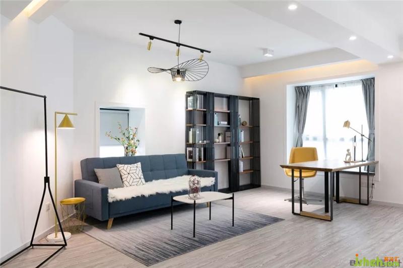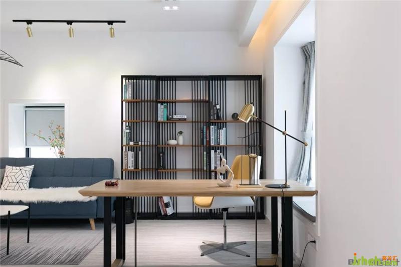 書房這一塊區(qū)域,利用灰藍(lán)色的沙發(fā)和金屬落地?zé)艟徍团P室的清冷氣息。