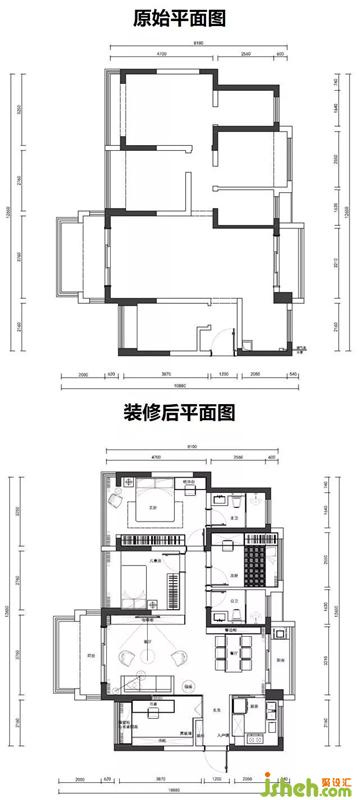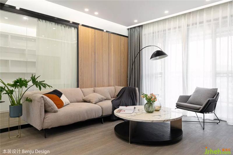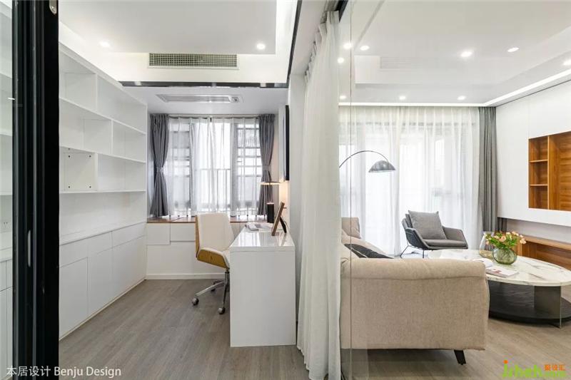 在戶型設計方面,這次并沒有太大的改動,只是將客廳與書房之間的隔墻打掉,直接改成了玻璃隔斷,增加了整個空間的通透感。室內設計師