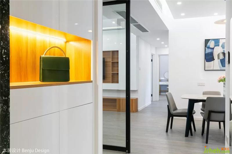 入戶玄關處,定制了白色+原木配色的鞋柜,我們統(tǒng)計了夫妻倆具體的鞋子數量、種類,以此來劃分鞋柜內的隔層大小高度,完全符合住戶的生活習慣。鞋柜還設計了開放格,進門后隨手放包,出門前再也不會忘記帶鑰匙啦。