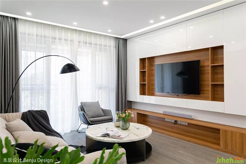 屋主要求整屋是簡約暖色調的風格,同時又具備收納的功能,因此我們將電視的背景墻設計收納柜,白色+原木色,簡潔而又富有生活氣息。室內設計師