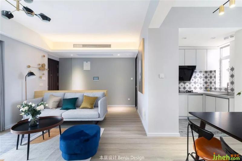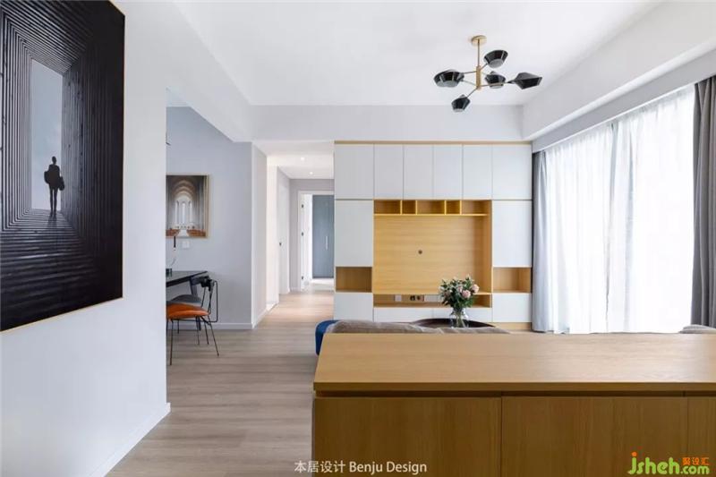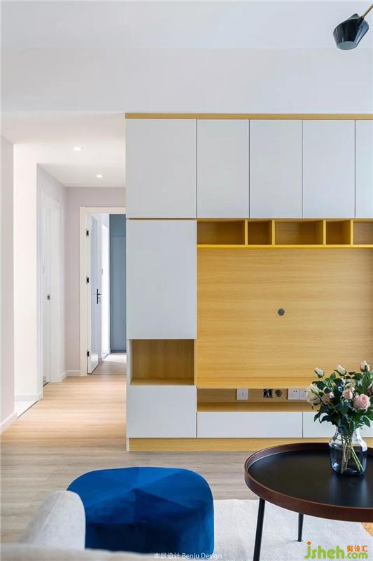 一進(jìn)門就是客廳,沒有可以作為玄關(guān)的區(qū)域且客廳空間也不是很大,所以增加了矮柜當(dāng)鞋柜,分隔玄關(guān)與客廳兩個區(qū)域,且矮柜不會遮擋客廳的光線。