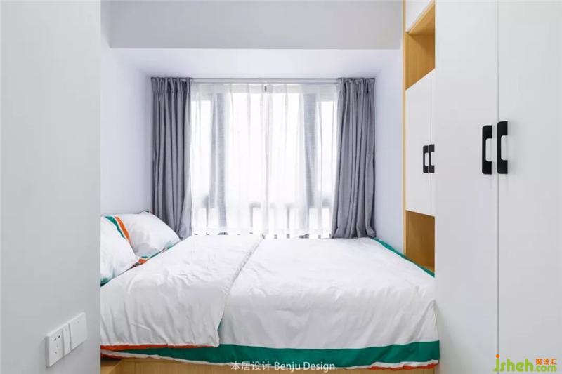 次臥床頭旁的墻向內(nèi)縮進(jìn),給主臥的衣柜騰出了空間。室內(nèi)設(shè)計(jì)師