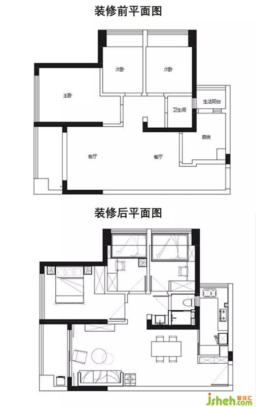 同時(shí)將餐廳和廚房的隔墻也后移了一些,擴(kuò)大了餐廳的空間,放下一張四人餐桌綽綽有余。但這樣的調(diào)整使廚房空間變得很小,所以最后將生活陽臺的空間劃歸廚房使用,讓廚房變成了一個(gè)長方形,不僅留出了冰箱的位置,廚房的使用面積也變大了。