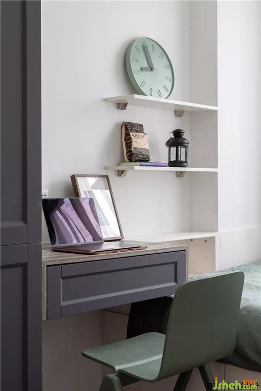壁式的書桌和置物架,實用美觀,空間占用面積不大,方便屋主在書房工作,累了可以直接癱倒在旁邊的榻榻米上。室內(nèi)設計師