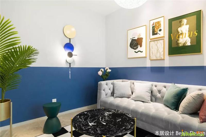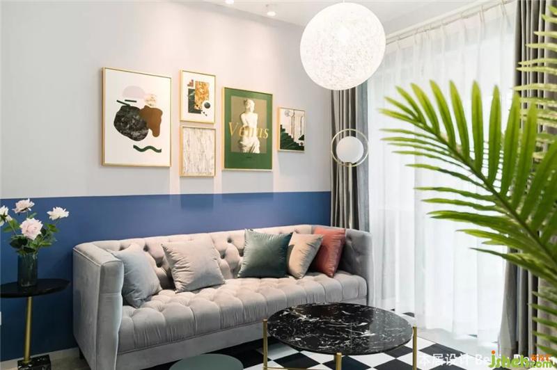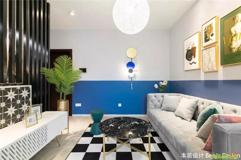 設(shè)計師在客廳墻體的設(shè)計上采用墻體雙拼的設(shè)計,整體以暗色調(diào)為主,搭配暖調(diào)的燈光,充滿藝術(shù)性的裝飾掛畫,營造出了一種浪漫柔和的氛圍。裝修設(shè)計