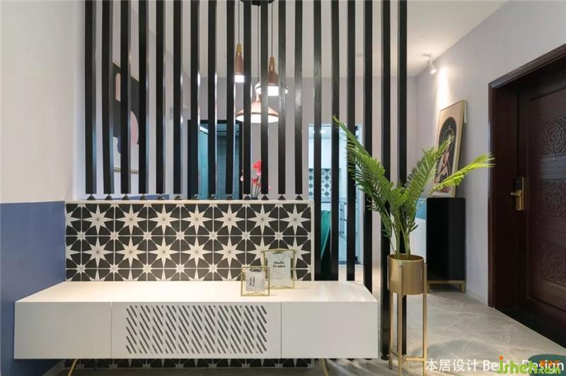 舍棄電視背景墻,利用半墻和黑色格柵將客廳與餐廳兩個區(qū)域自然地分隔,半墻的花磚搭配柵欄的色系,簡約高級的設(shè)計,為空間增添質(zhì)感。裝修設(shè)計