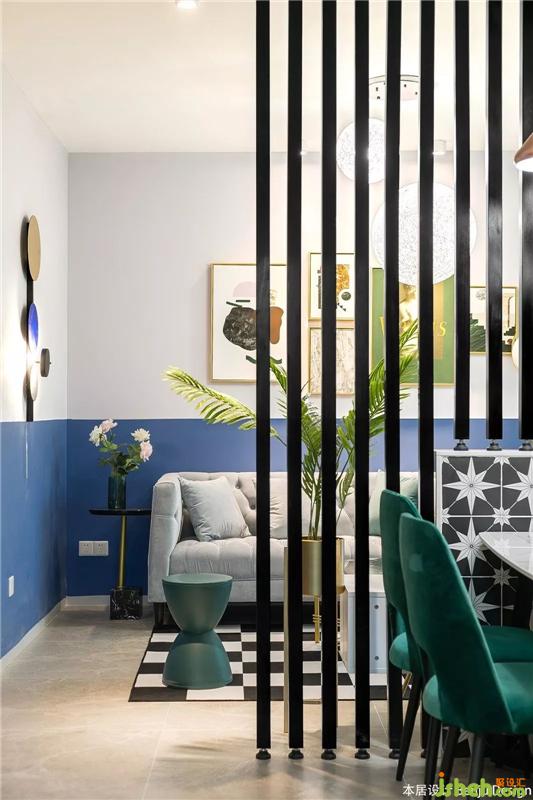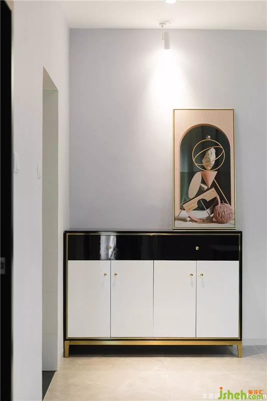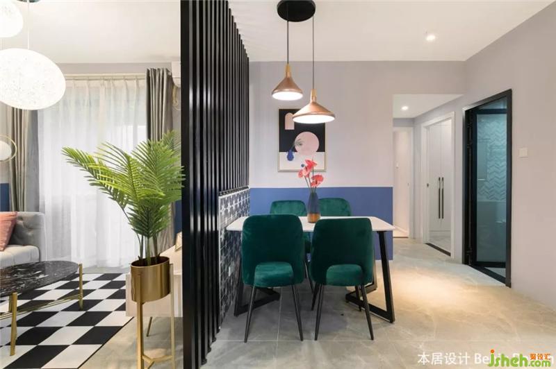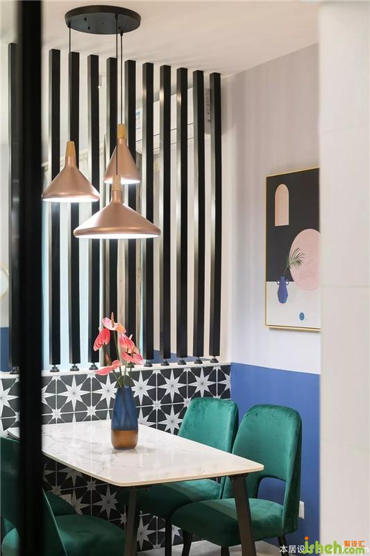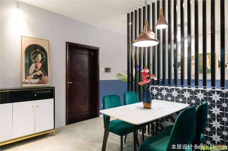 墨綠色的餐椅,讓現(xiàn)代風格中夾雜著一絲復古的氣息,金屬三頭吊燈,使餐廳的氛圍恰到好處。門邊的放置餐邊柜,補充客廳與餐廳的儲物空間。裝修設(shè)計