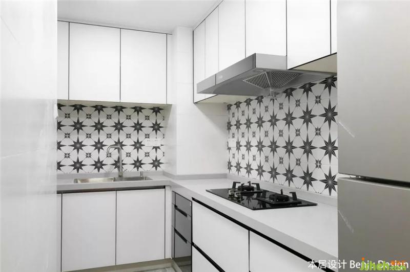 廚房相對客餐廳來說較明亮,整個空間以純白為基調(diào),搭配小花磚。電器均是嵌入式的,節(jié)省了操作臺的面積,同時平面化的觀感,使廚房更加整潔有序。裝修設(shè)計