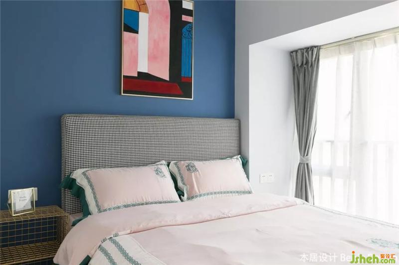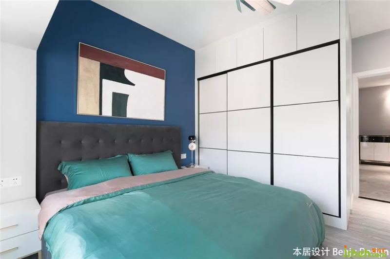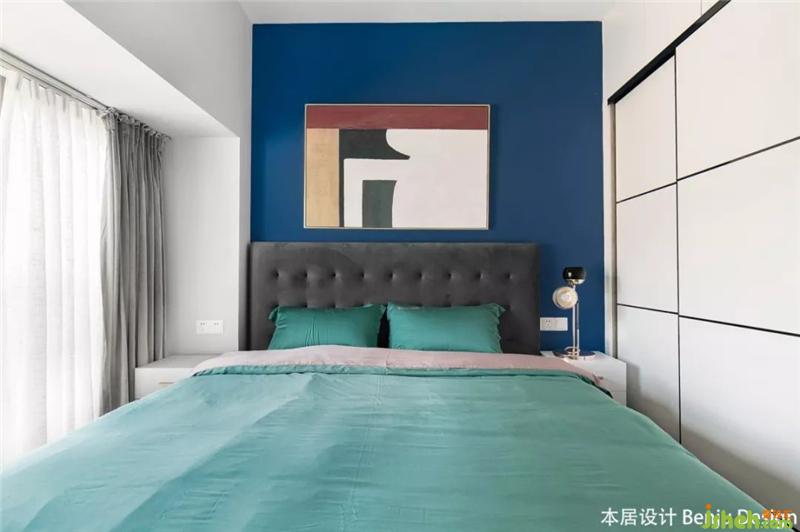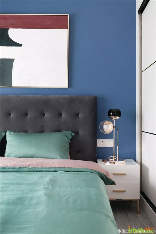 次臥的床頭背景墻與主臥一致,同樣的深藍色搭配抽象掛畫,加上金屬框床頭,摒棄傳統(tǒng)而笨重的輪廓,硬朗的線條讓空間的現(xiàn)代感十足。
