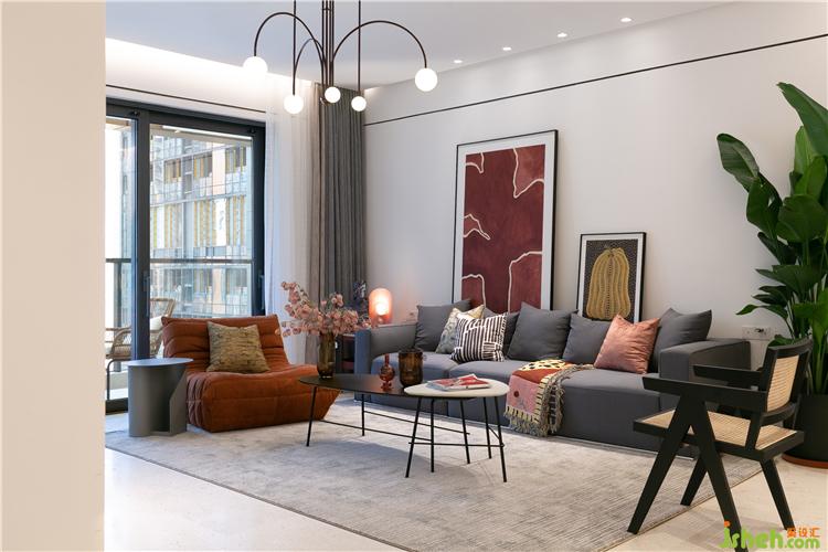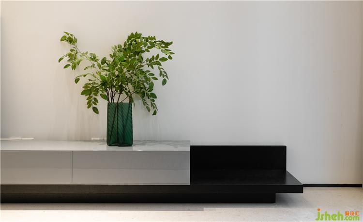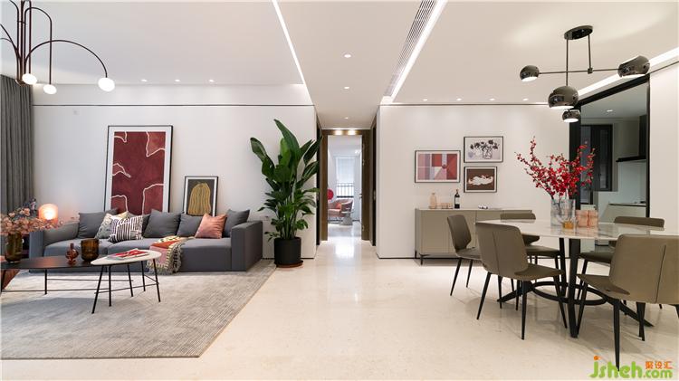客廳的整體色調(diào)以白色+灰色為主,誠然在華潤城黑白極簡的硬裝基礎(chǔ)上,室內(nèi)設(shè)計師需要為它注入鮮活的色彩,所以在空間中的軟飾,我們用了大量的紅色來點綴。在視覺焦點的沙發(fā)區(qū)域,用大幅的掛畫來營造視覺的沖擊感,以及塑造空間的藝術(shù)感。