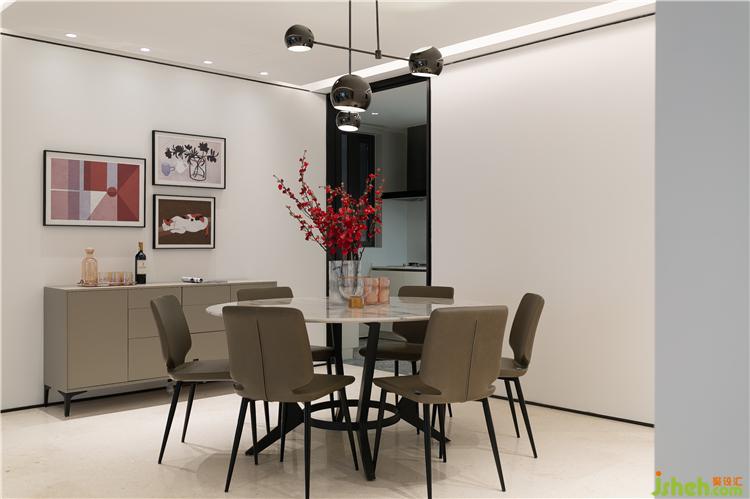 一張精致的白色大理石餐桌搭配淺灰皮質(zhì)餐椅,金屬式底座與大理石、布皮質(zhì)地結(jié)合,剛?cè)岵?jì)中透露的,是一種自然的美。