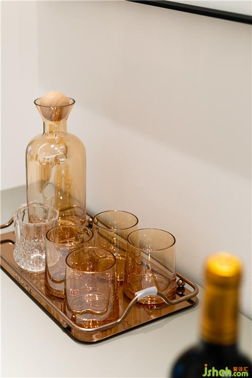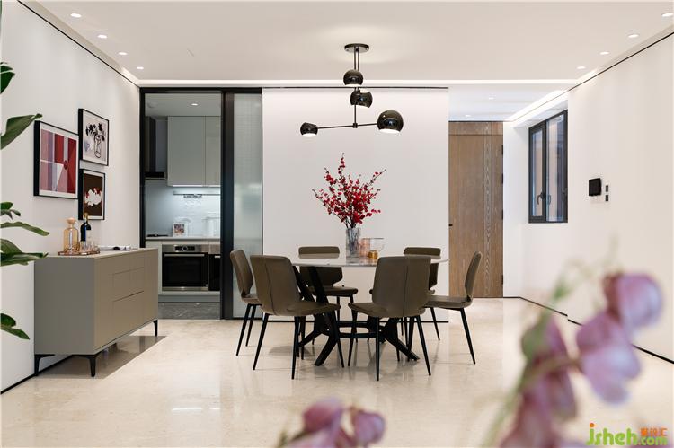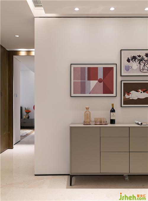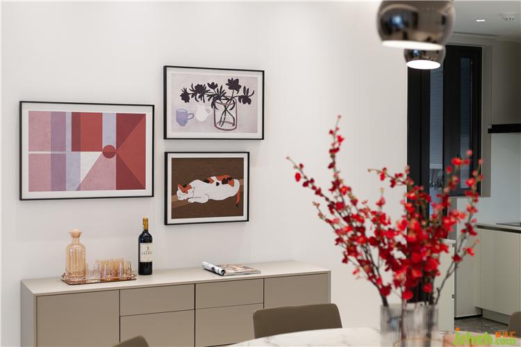 灰色餐邊柜簡(jiǎn)潔精致,室內(nèi)設(shè)計(jì)師加上幾幅抽象幾何和靜物裝飾畫,少量且多種顏色的趣味碰撞,簡(jiǎn)單卻高級(jí),瞬間成為餐廳吸睛一角。