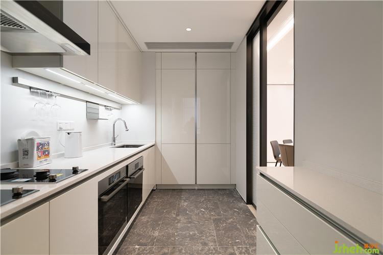 潤(rùn)府的精裝廚房,極簡(jiǎn)的黑白配色,洗切炒一氣呵成的操作臺(tái),盡頭是整體式雙開門冰箱,整體空間寬暢,收納充足。