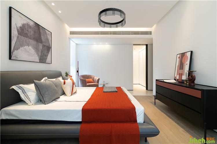 主臥部分延續(xù)了客廳風(fēng)格,黑色皮質(zhì)的大床舒適高級(jí),加之紅色床品的點(diǎn)綴,好看又吸睛。床頭的黑白紋理掛畫,緩和了整面大白墻的尷尬,也是顏值提升的一大關(guān)鍵。