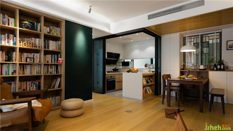 ▼打通封閉的廚房空間,用多扇對(duì)角推拉門(mén)做成可分可合式,這樣一來(lái),不但增強(qiáng)了餐廚客三個(gè)空間的交互性,也使得整個(gè)布局也變得更加活潑豐富。