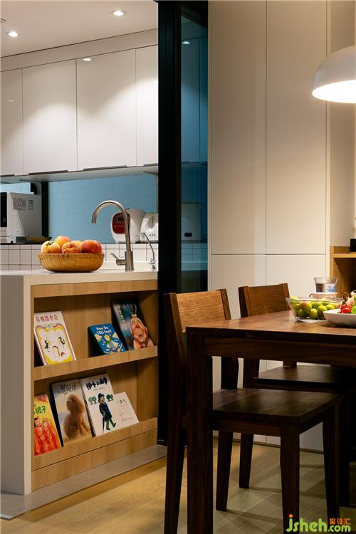 ▼在多元化的起居空間里,餐廳的長桌也可以不是傳統(tǒng)意義上的餐桌,可用餐,可品茶,打開電腦也可以是一個簡單的工作區(qū)。這里還有個小細(xì)節(jié),開放的廚房吧臺靠餐桌一邊,設(shè)計(jì)師在“書本隨處可取“的考慮之下,設(shè)計(jì)了兩排小的置書架,或許,餐桌也是“書桌”。室內(nèi)設(shè)計(jì)師