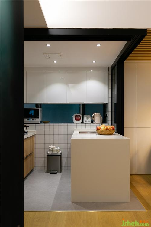 ▼說到走廊過道,這里不得不多提一下,為了避免空間的浪費(fèi),設(shè)計(jì)師在走廊的兩側(cè)附加了三個功能區(qū)——廚房外置大冰箱;干濕分區(qū)衛(wèi)生間;電系洗衣家政區(qū)。這樣一來,不僅避免了單獨(dú)走廊帶來的沉悶感,空間利用率也大大提升。