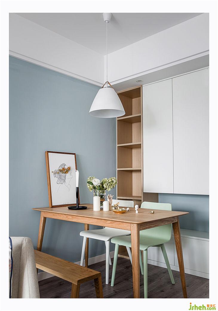 ▲餐桌區(qū)域雖然小,但是色彩的搭配上和設(shè)計師討論了很久,也看了非常多的餐桌方案。最后選擇了白橡木的餐桌和條凳,然后和燈以及整體空間色系搭配的椅子,一眼望去的東西全是淘寶買的,質(zhì)量還不錯。