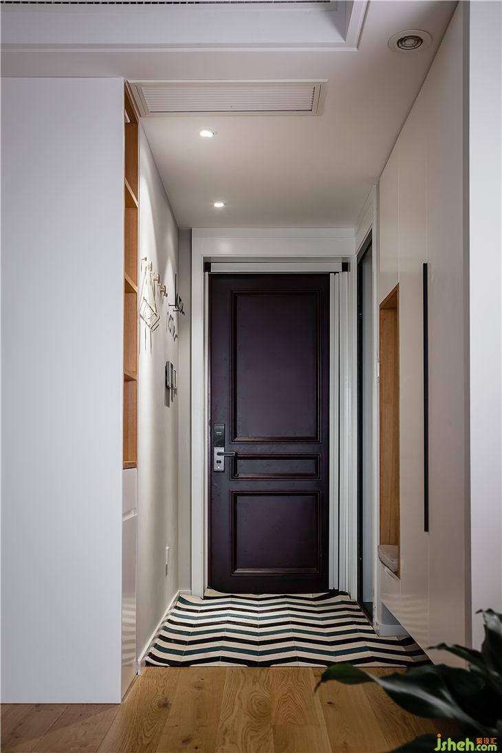 入門(mén)處的內(nèi)凹的是換鞋凳,原木色突出與白色形成鮮明的對(duì)比,卡座后面是可以掛些日常衣服,鞋柜里的層板不到底,形成落灰在一處,底座的kd板是可以移動(dòng)的,這樣就可以保持鞋柜干凈并不潮濕,因?yàn)榈鬃型笟饪祝黾恿诵竦耐笟庑?。換鞋凳對(duì)面是餐邊柜對(duì)外使用,增加實(shí)用收納功能。