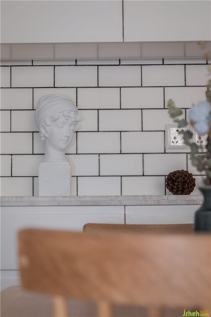 采用小白磚加黑色的美縫,拉升空間視覺感受。為了讓整體空間更加和諧,采用了爵士白大理石臺(tái)面。設(shè)計(jì)公司