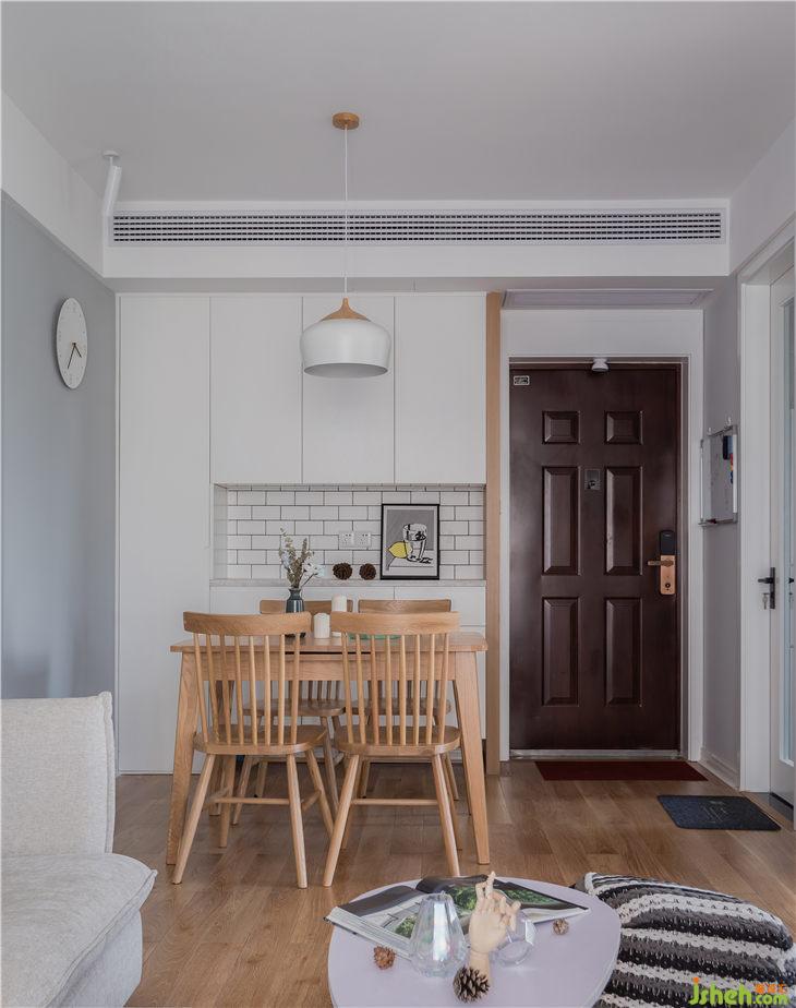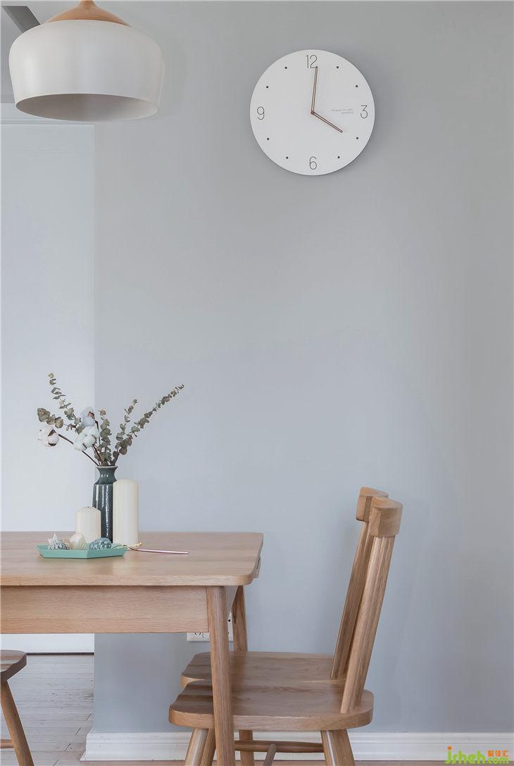 原木色的餐桌椅搭配典型北歐風(fēng)格的吊燈,淺灰色的墻面,白色圓鐘作為裝飾。一切看上去是那么和諧、簡(jiǎn)約、自然。