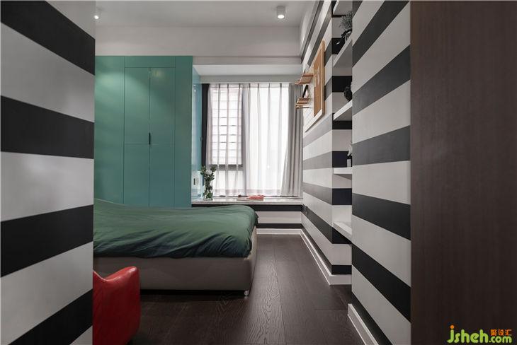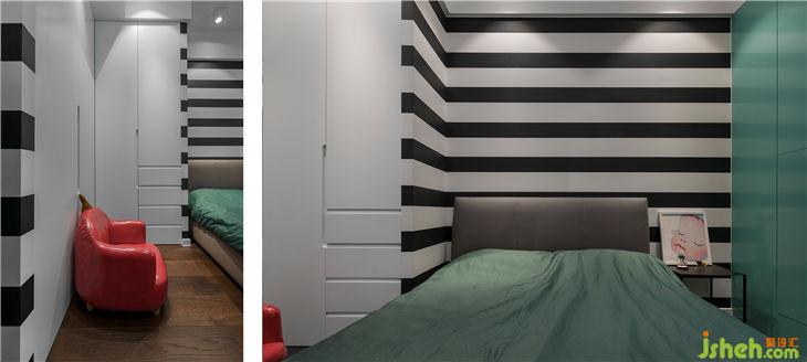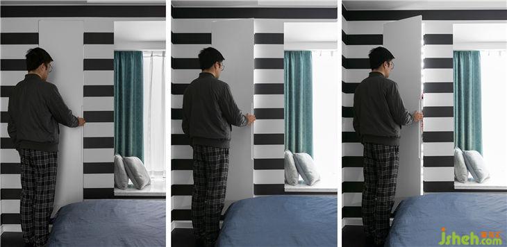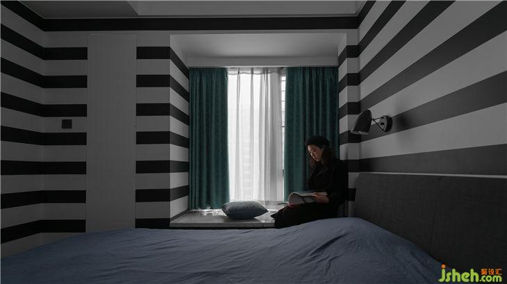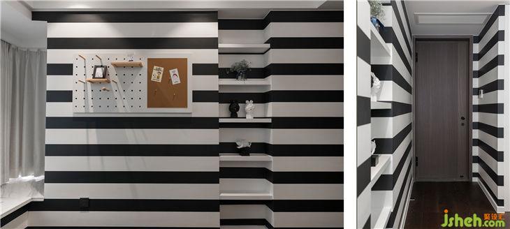 入戶門采用了隱形門的方式,黑白條紋墻面增加了視覺上的延伸性和空間的統(tǒng)一性。窗簾采用了亞麻布簾,通透了采光的同時也保證了自身的私密性。飄窗邊上的設備平臺也包進來做儲存柜,可以放些較大件的物品。