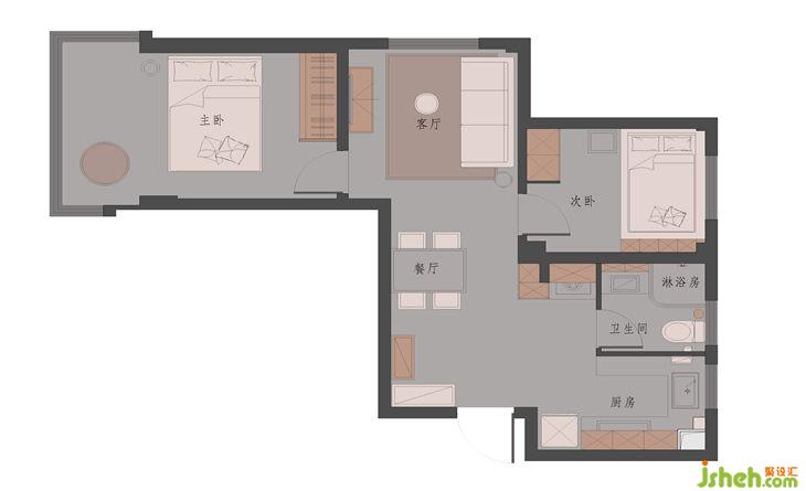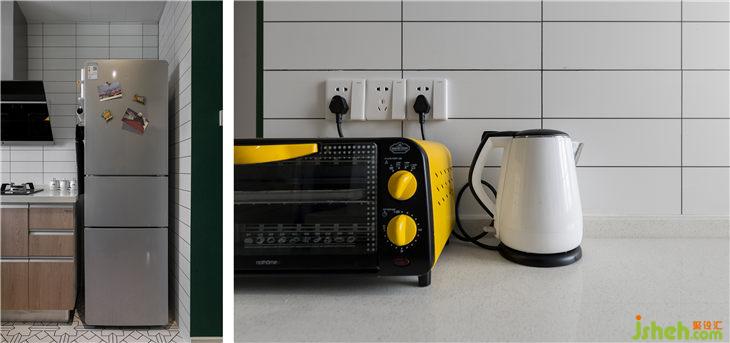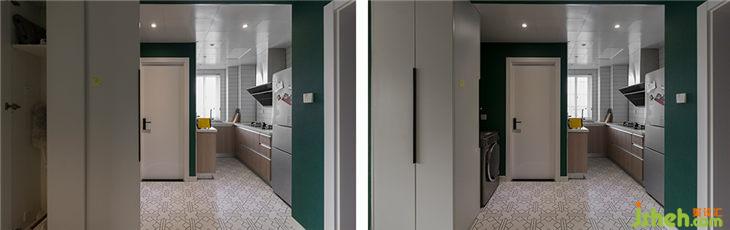 廚房和衛(wèi)生間原先的墻體拆除砌成薄墻,將現(xiàn)在進(jìn)入衛(wèi)生間的門洞封住,把廚房和衛(wèi)生間的區(qū)域分離開來,廚房變身U型廚房。這樣除了正常布局外,增加了一排窄的柜子放置小家電。