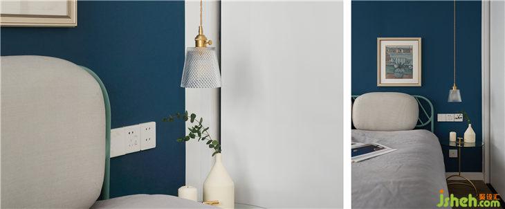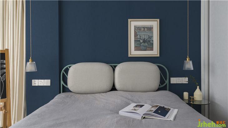 在三面留白的襯托下,海軍藍(lán)的床頭背景墻,整個(gè)空間凸顯了一種獨(dú)特的寧靜感。