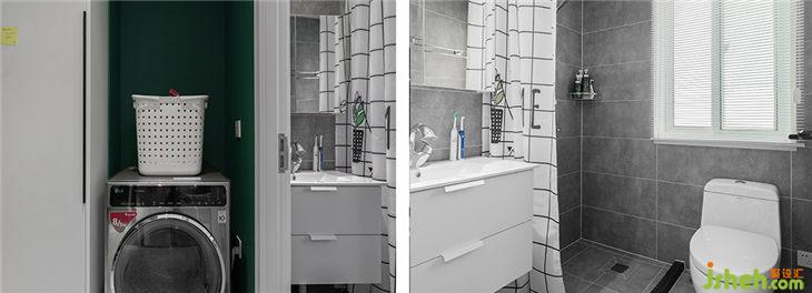 衛(wèi)生間的部分原先設(shè)想是,實(shí)現(xiàn)干濕分離。將洗衣機(jī)+臺(tái)盆區(qū)域和濕區(qū)分離開來,可沒想到,拆除完之后發(fā)現(xiàn),蹦出來個(gè)水管(也就是原先鞋柜后面的位置)。淋浴房面積較小,我們采用的是浴簾的形式,又不相把洗衣機(jī)放在里面,于是決定,將洗衣機(jī)+臟衣籃及收納的部分放在外面,臺(tái)盆+淋浴房+馬桶的區(qū)域放在里面的空間,也就是現(xiàn)場(chǎng)呈現(xiàn)的方案。