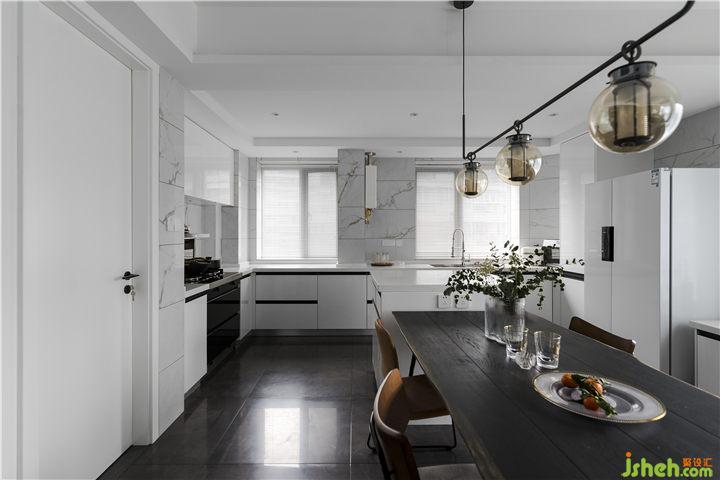 因為原廚房位于整個空間的中間位置,廚房到餐廳的生活動線很不方便,所以敲掉了小房間的墻,把北面的光線引入到戶的同時又擴大了廚房使用空間!讓廚房、餐廳、客廳成為一體,讓整個空間變得更加敞亮、光線通透。