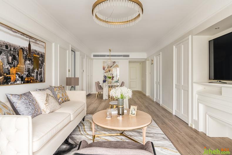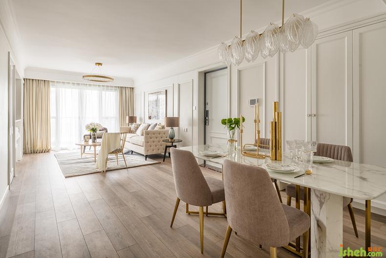 客廳和餐廳在漸次有序的木線條中流暢過(guò)渡,金色在米白色的背景中流露出浪漫主義情懷。