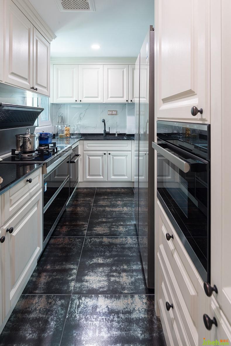 考慮到廚房耐臟防滑的問(wèn)題,設(shè)計(jì)師運(yùn)用復(fù)古深色地板,L型功能臺(tái)讓窄小廚房更加井然有序。深圳設(shè)計(jì)公司
