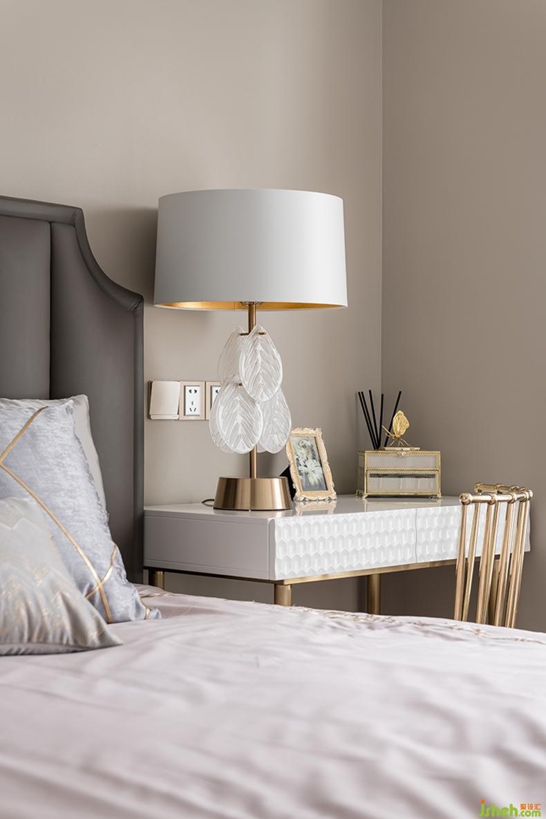 主臥用淺灰色墻面做背景,再用不同深淺的灰色讓畫(huà)面動(dòng)起來(lái),加入少許金色調(diào)劑,床品與擺件帶來(lái)高級(jí)感,臥室去繁從簡(jiǎn),歸于平靜。