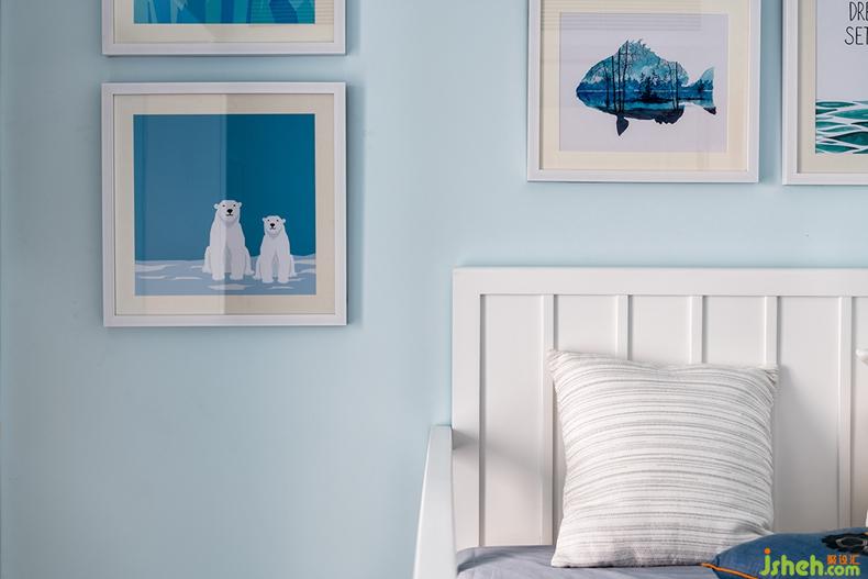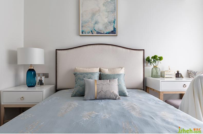長輩房以清亮又明快的淺灰藍色為主色系,自然地漸變美感,猶如掛畫中的調(diào)色以最柔和的方式暈染開來,讓臥室純凈又安靜。