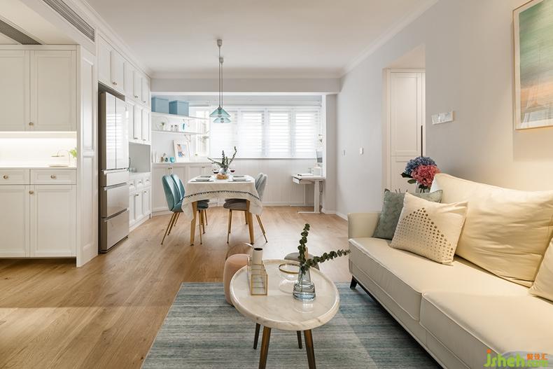 純白的百葉窗簾巧妙地過濾了自然光線,使空間更加通透明亮。工藝感十足的吊燈,溫馨的純色布藝沙發(fā),小小的客廳,幸福的溫度脈脈而生。