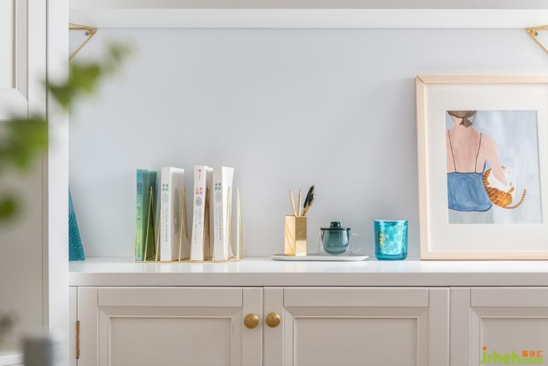 玻藍色的床品與窗簾、裝飾畫的顏色融為一體,這一抹純凈的藍為臥室披上一層溫暖繾綣的外衣,實木的肌理,內(nèi)斂的祖母綠,流露著臥室的靜。