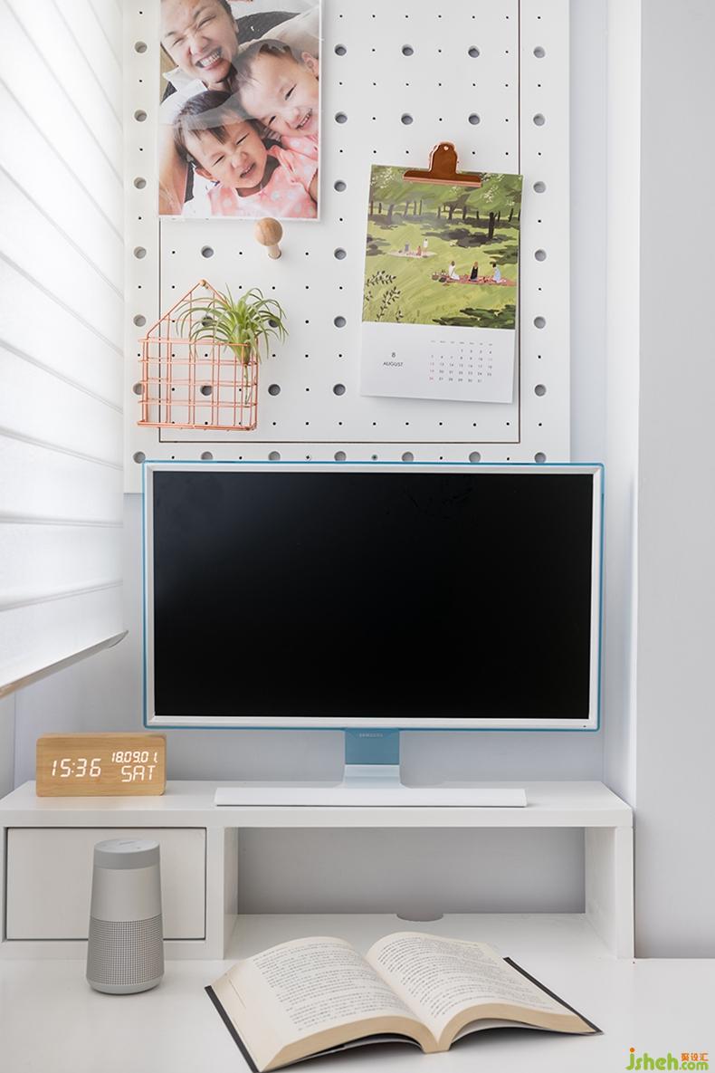 書桌與餐廳相鄰互不干擾,大面積白色帶來明澈柔和的感受。書柜充分發(fā)揮收納實用功能,填滿主人與雙胞胎女兒的幸福生活軌跡。