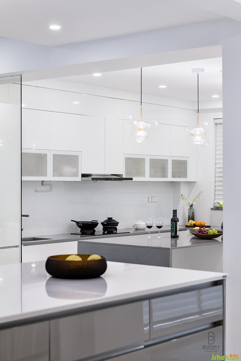 開放式餐廳將烹飪與用餐空間合二為一,成為最具生活滋味的區(qū)域。略帶暖意的大象灰結(jié)合純透的白,裝飾櫥柜、餐桌,打造出清雅立體的視感。