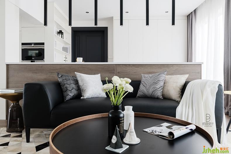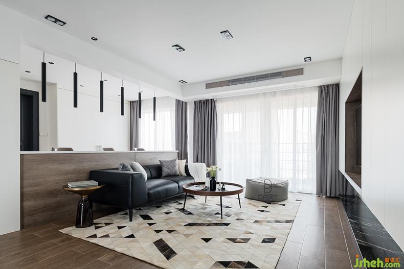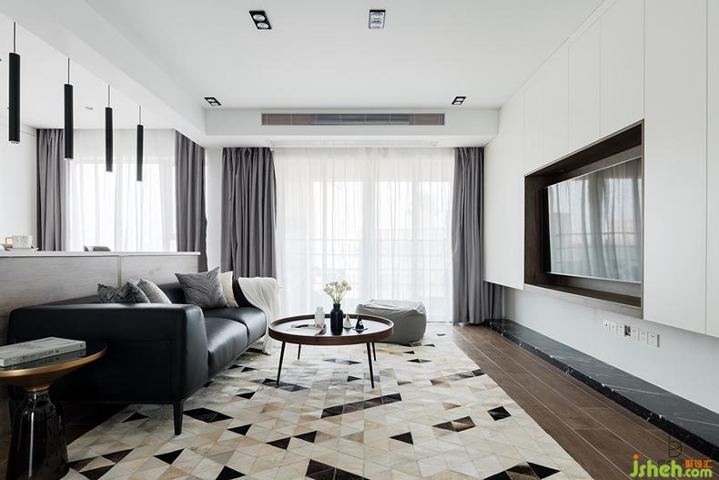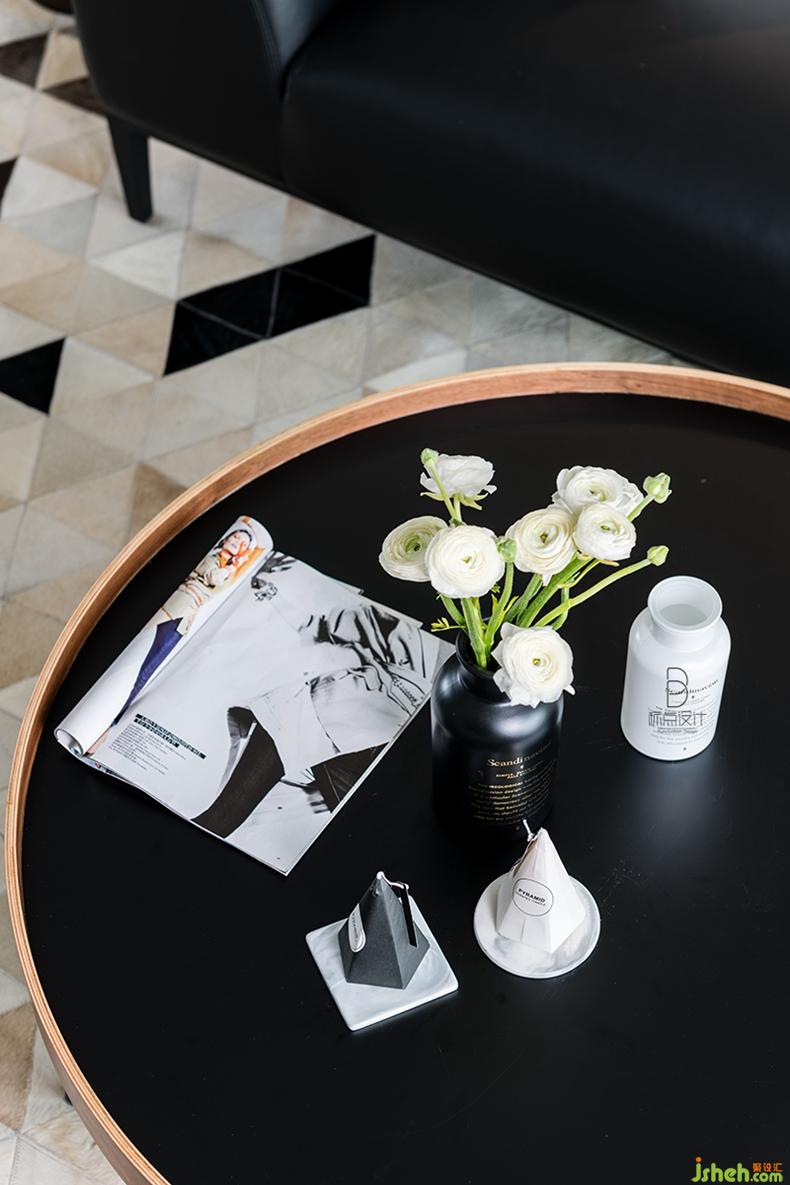 室內設計師將黑色運用到圓幾、沙發(fā)、地毯甚至花瓶中,起到點綴效果,增加藝術質感。同時幾何圖形拼接的真皮地毯為空間增添了質感