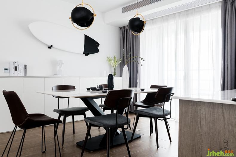 小巧精致的黑白花瓶、石膏人像裝飾為空間增添了柔和的女性氣質。墻面又以男主人的愛好沖浪板來裝飾,凸顯出主人對自由和個性化的追求。小株植物更為房間增添了色彩和自然氣息。